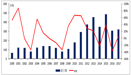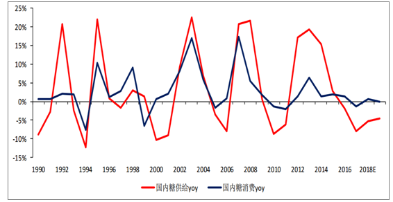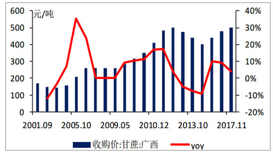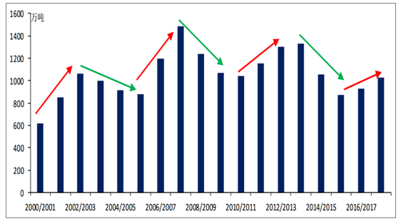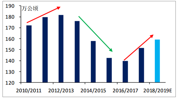 我國甘蔗主產區廣西實施甘蔗最低收購價政策,每年開榨前制定當年甘蔗收購價。2017/2018榨季廣西甘蔗收購價由475元/噸提高至500元/噸,種植面積進一步增加。此外,從歷史上來看,我國糖產量仍處于三年增產周期,預計國內糖2018/2019榨季供應增加。