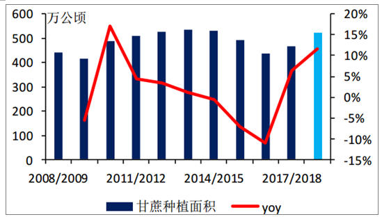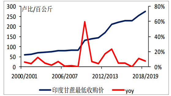1998年為保護國內甘蔗種植戶收益、抑制糖價大幅波動,印度政府開始實施甘蔗收購價政策。2018/2019榨季印度政府將甘蔗收購價由255盧比/100公斤提高至275盧比/100公斤,高于印度甘蔗種植成本70%以上。受此影響,預計2018/2019榨季印度甘蔗種植面積顯著增加,甘蔗產量或將再度增加。