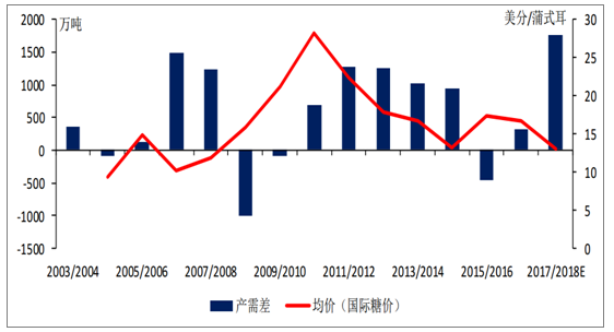 國際糖價與全球產需差成顯著負相關關系,具體表現為:全球產需趨緊或者出現缺口,國際糖價上漲;產需過剩,國際糖價下跌。全球糖價漲跌通過進口傳導至國內,從而引發內糖價格變動。
