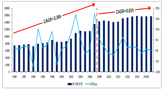 自1990年以來,我國白糖消費經歷了快速發展期與穩定期兩個階段:1990-2007年間白糖消費受到經濟發展與人口增長的拉動快速提升,由1990年745.1萬噸增長到1350萬噸,增長81.18%,年復合增長達到3.36%;2008年后由于經濟發展疲軟等原因,白糖消費穩定在1400-1600萬噸左右。