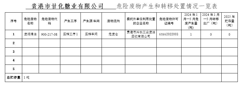 我公司共產生1種危險廢物,2023年危廢貯存量 共0噸,2024年1月至3月產生危廢共1噸,轉移處置0噸,所有危廢均轉移到符合國家資質的處置單位,具體轉移處置種類和數量信息如下表所示:
