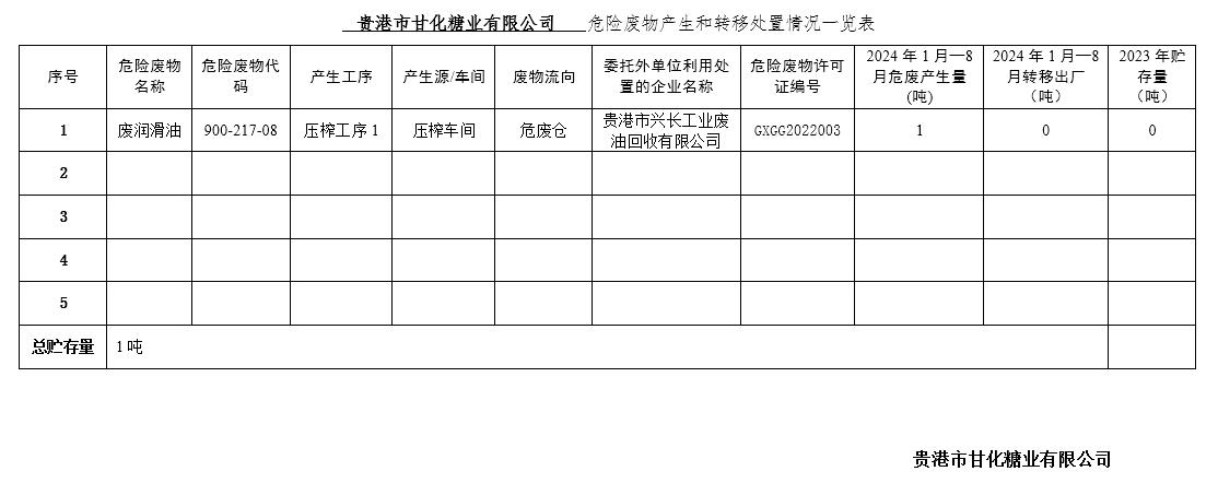 我公司共產生1種危險廢物,2023年危廢貯存量 共0噸,2024年1月至8月產生危廢共1噸,轉移處置0噸,所有危廢均轉移到符合國家資質的處置單位,具體轉移處置種類和數量信息如下表所示: